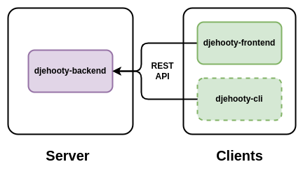 Le serveur, aussi appelé backend, est responsable de toute la logique métier et de la gestion des données. Il expose une interface (API) à laquelle des clients peuvent se connecter pour interagir avec le cœur de Djehooty.